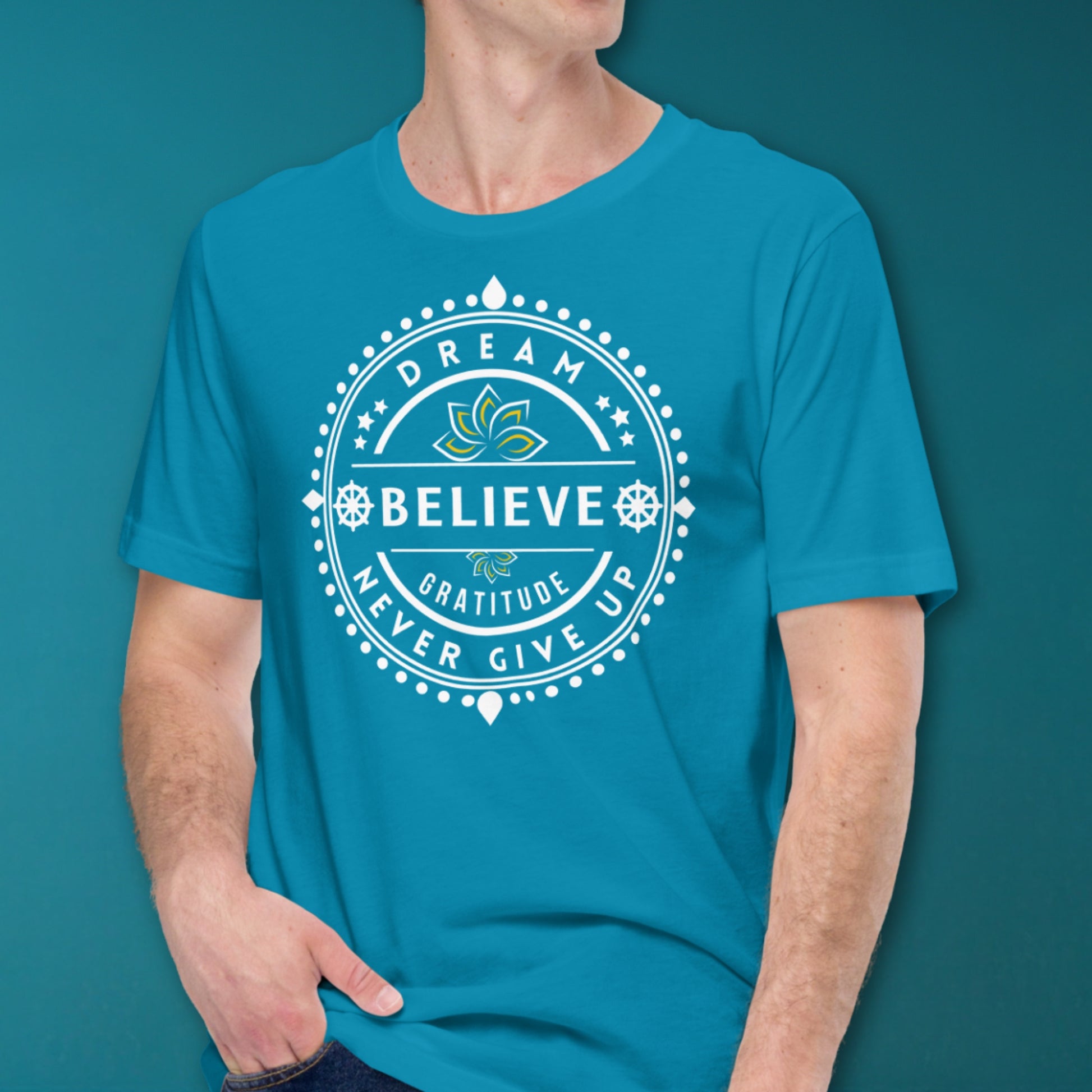 Elevate your daily wardrobe with our "Mindful Living with Attitude T-shirt" – a statement piece that's more than just clothing. Each shirt is a testament to the power of positive thinking, featuring a thoughtfully designed emblem that represents the core values of Dream, Believe, Gratitude, and Perseverance.