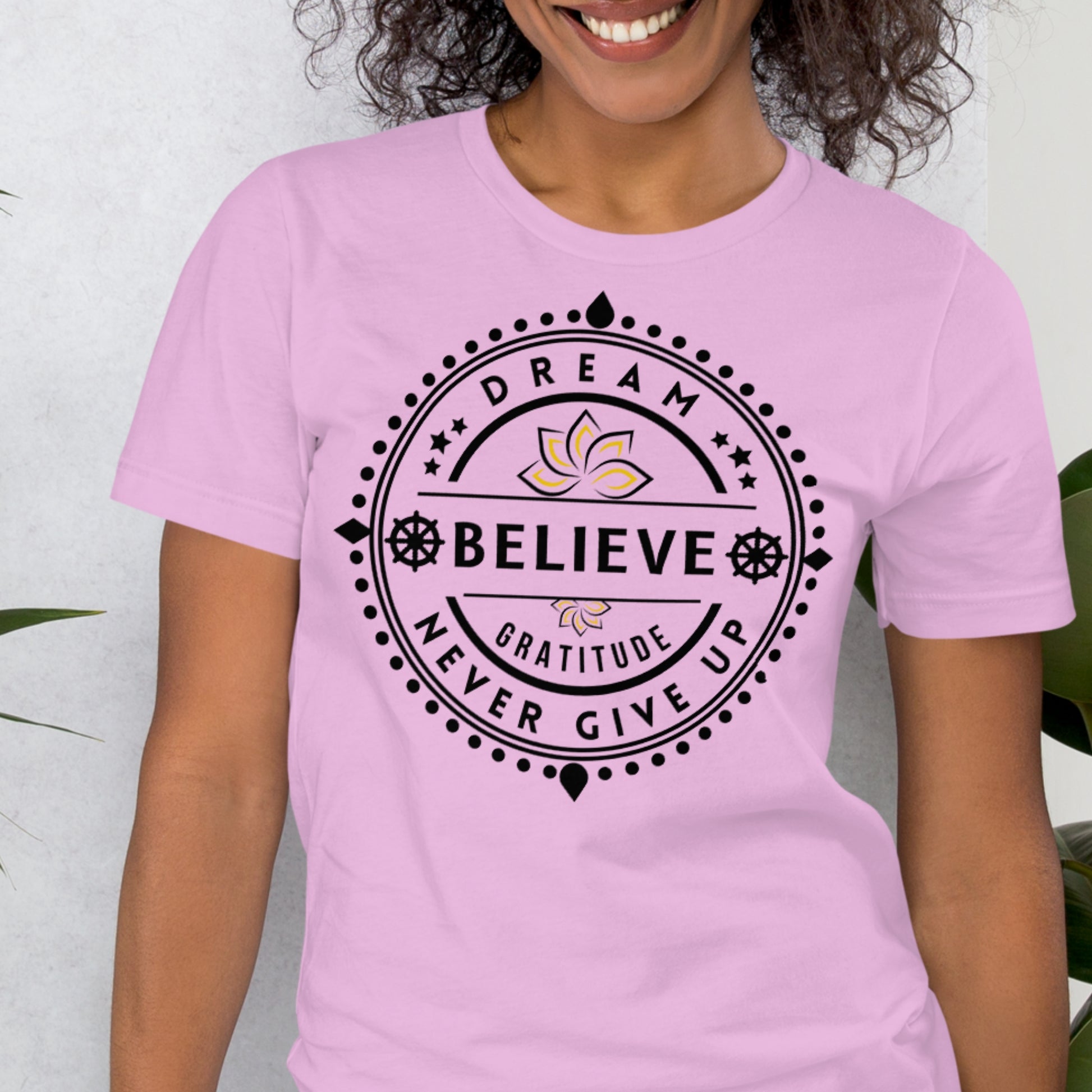 Elevate your daily wardrobe with our "Mindful Living with Attitude T-shirt" – a statement piece that's more than just clothing. Each shirt is a testament to the power of positive thinking, featuring a thoughtfully designed emblem that represents the core values of Dream, Believe, Gratitude, and Perseverance.