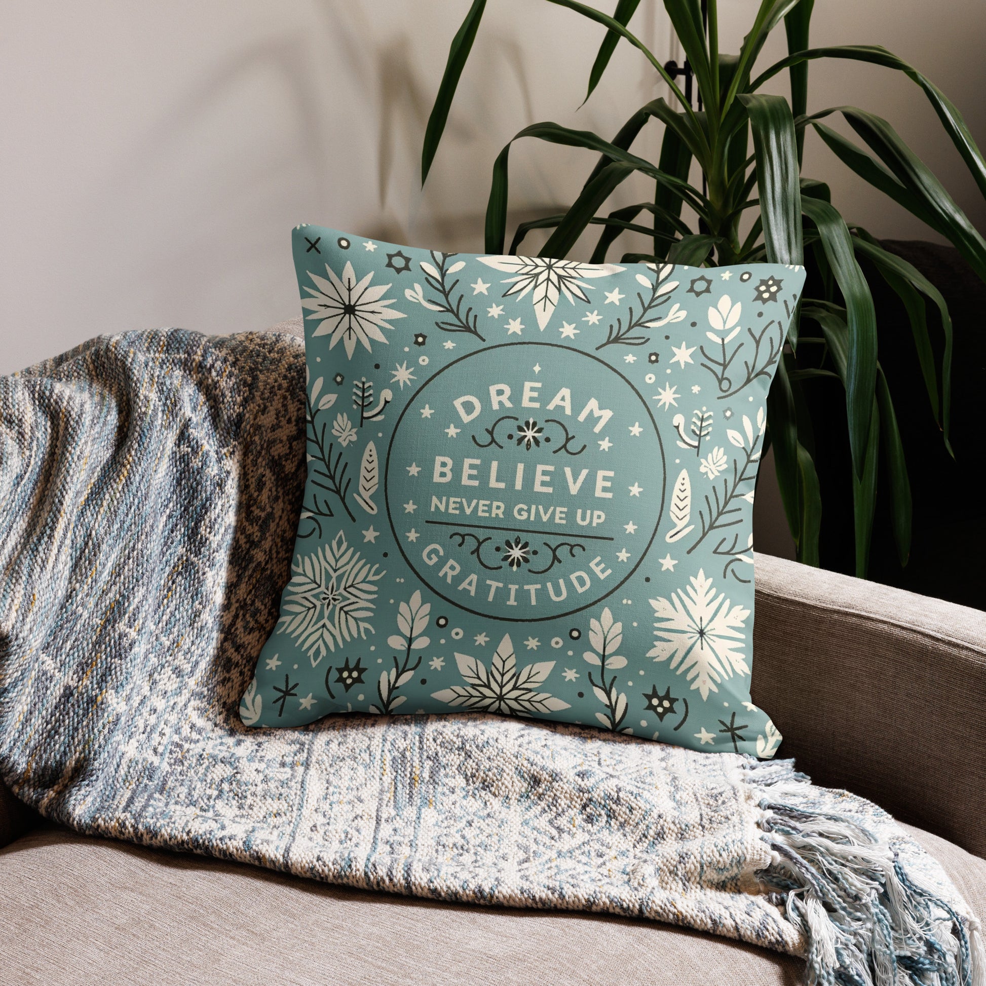 Add a touch of inspiration to your home with our Motivational Quote Pillow Case. This elegant design features the uplifting mantra "Dream" and "Gratitude," making it a perfect home accessory or a thoughtful holiday gift.