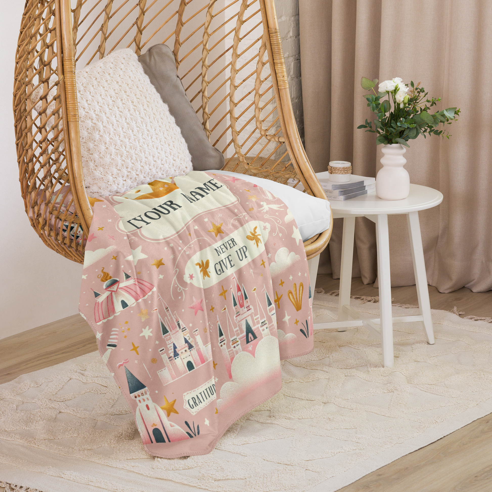 Enter a fairy tale with our Enchanted Princess Personalized Sherpa Blanket, perfect for your little love. This magical blanket features a dusky pink backdrop sprinkled with stars, cheerful suns, and fluffy clouds, leading to majestic castles and charming princesses.