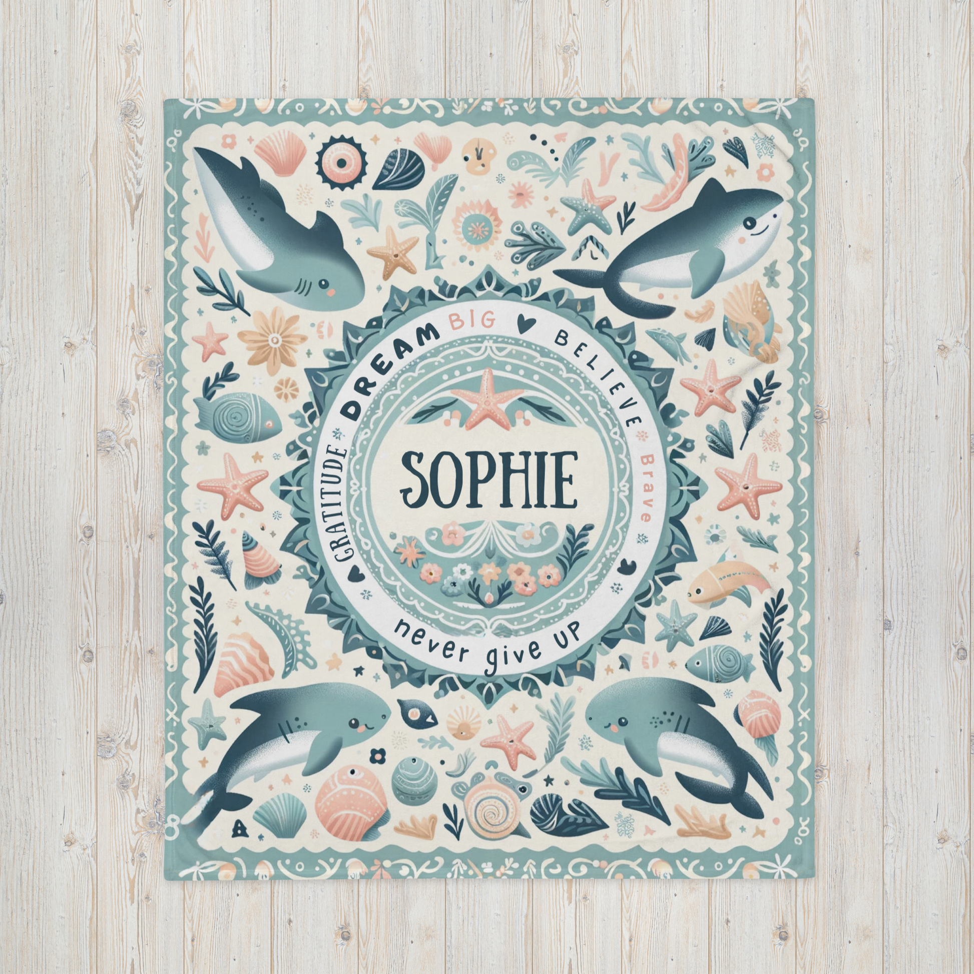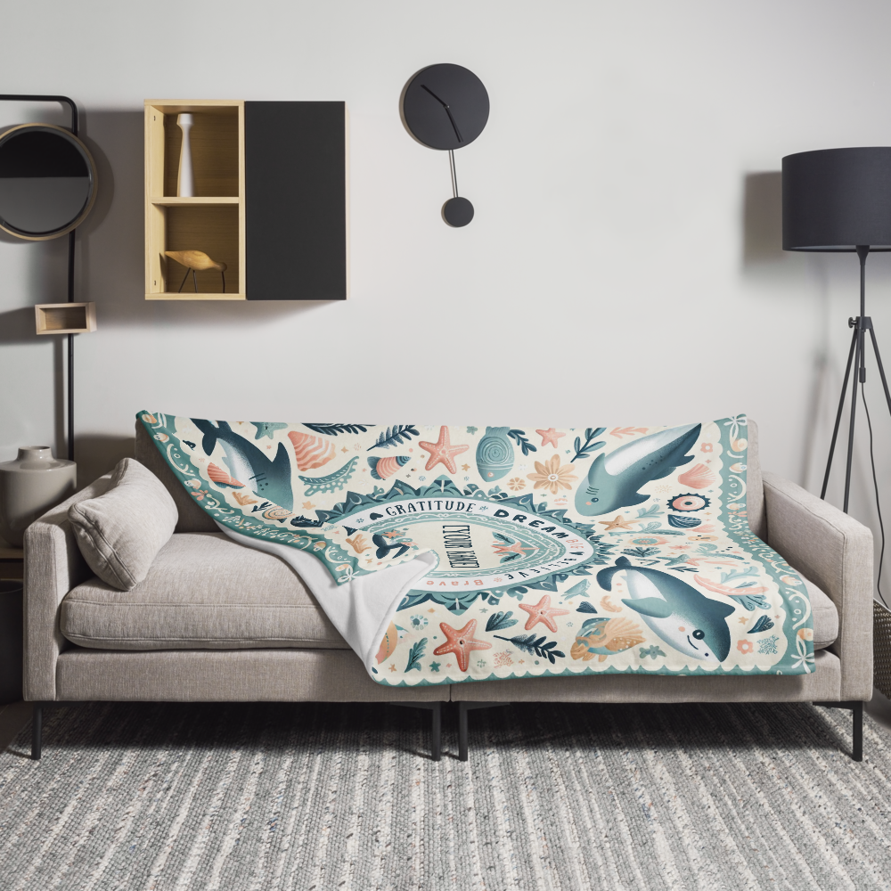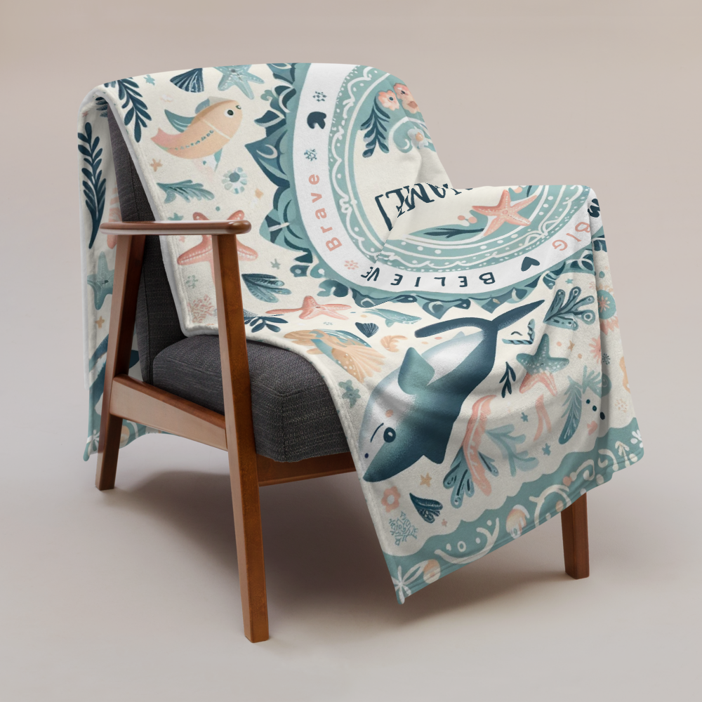 Wrap yourself in the comfort of the sea with our Personalized Ocean Wonders Throw Blanket. Designed to bring the serene beauty of the ocean into your home, this throw features an enchanting array of marine life, from playful dolphins to delicate starfish, all rendered in a soothing pastel palette.