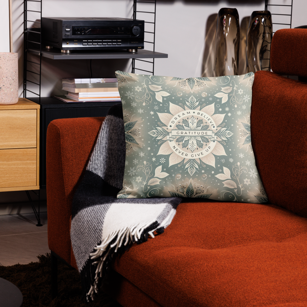 Cozy up this holiday season with our Winter Wonderland Inspirational Pillow Case. Adorned with a serene snowflake and foliage design, this pillow case carries the heartwarming messages of "Dream, Believe, Gratitude, Never Give Up" to inspire and uplift.